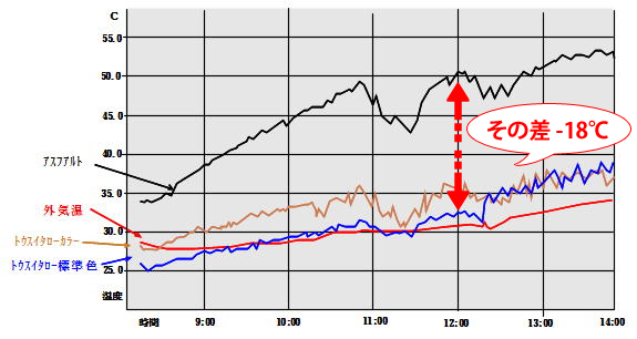 トウスイタローは、アスファルト舗装に比べ、10℃~18℃も表面温度を抑えることがわかっています。